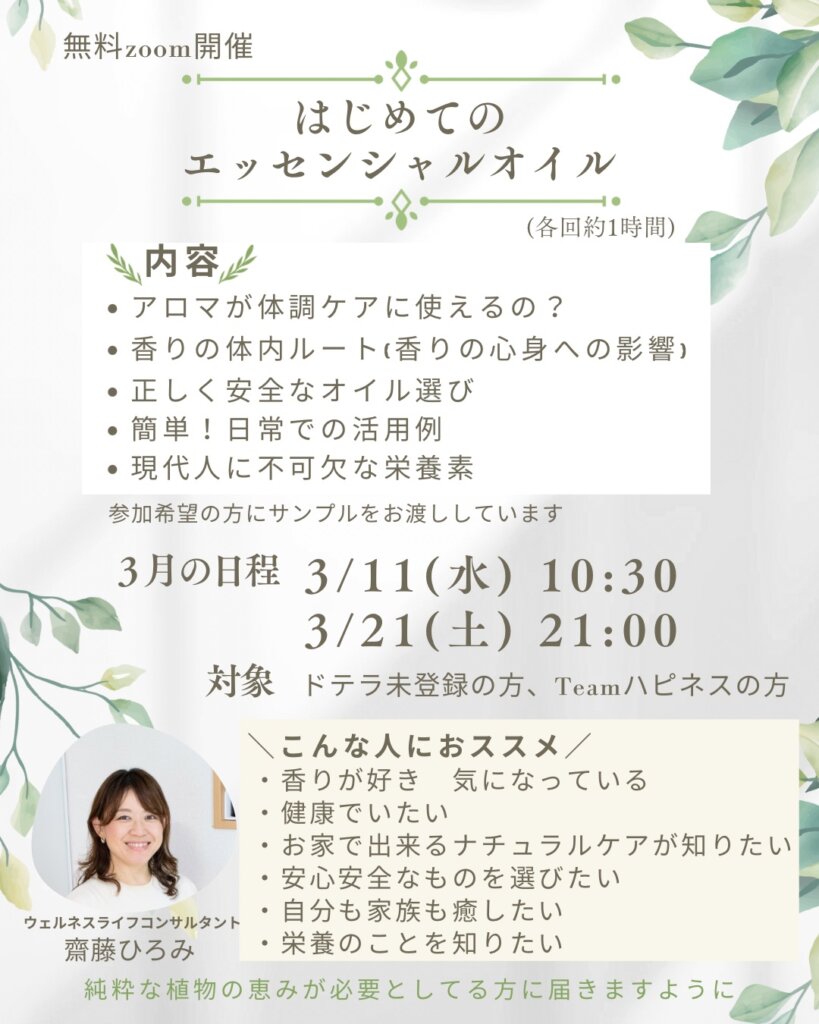 エッセンシャルオイルのことが気になっている方に向けた、60分の無料ZOOMセミナーです。受講ご希望の方には事前にエッセンシャルオイルのサンプルもプレゼントしています。『香り』を日常に取り入れて健康的なライフスタイルを楽しみませんか。